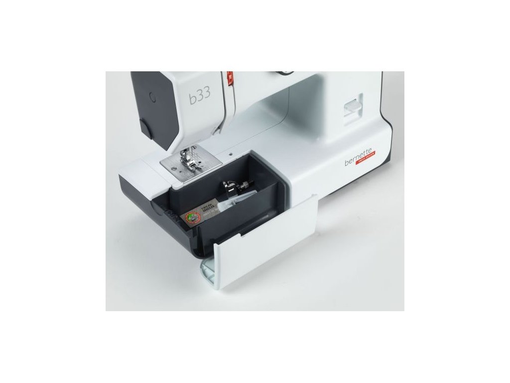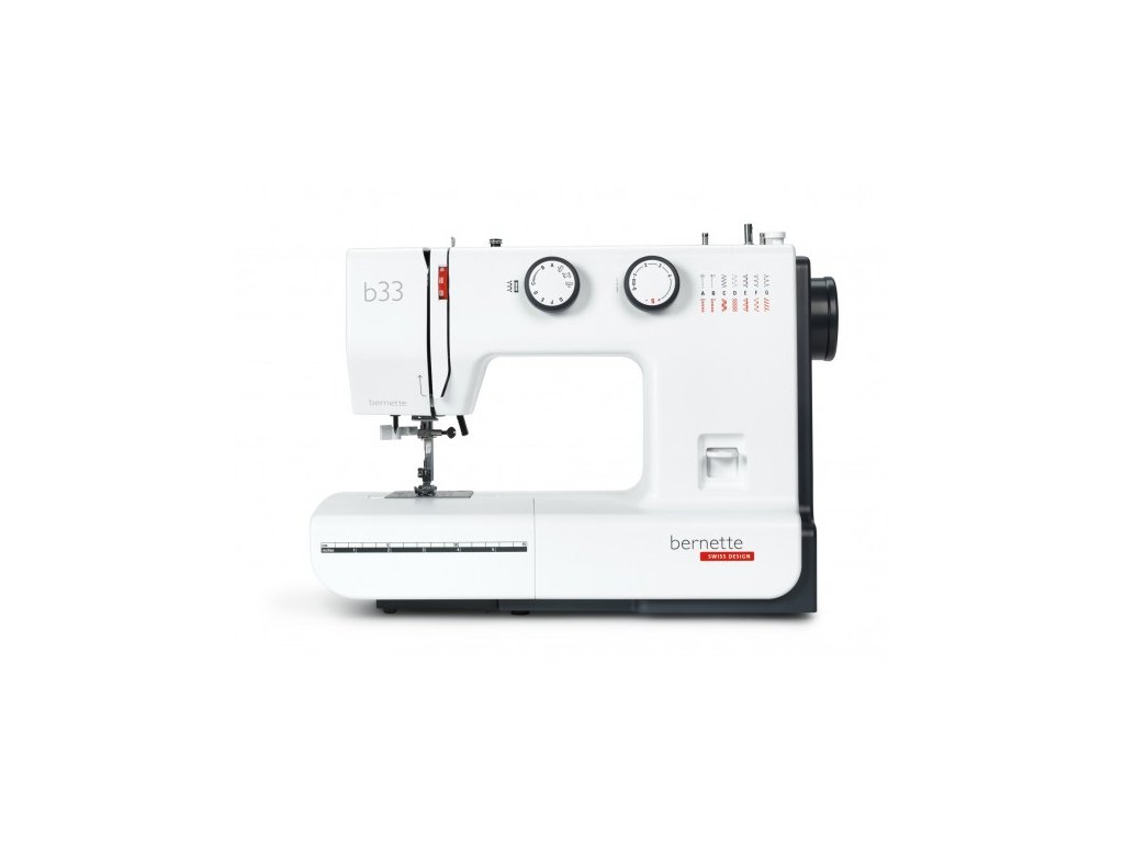 Šijací stroj Bernette b33 je mechanický domáci šijací stroj, ktorý má 15 šijacích programov, kývny CB chapač a voľné rameno. Má robustnú kovovú konštrukciu, ktorá zaisťuje stabilný chod aj pri veľkom zaťažení. Je výborným pomocníkom aj pre začiatočníkov. Šijací stroj šije 4-krokovú gombíkovú dierku, umožňuje šitie dvojihlou a má reguláciu prítlaku pätky. Stroj má rýchloupínacie pätky - jednoduchá a rýchla výmena pätiek. Na stroji je možné polohovať ihlu (doprava/doľava) a regulovať šírku stehov až do 5 mm.