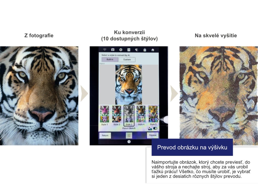 - Tvorba výšiviek - odfoťte obrázok vo vyšívacom rámčeku, pošlite ho do stroja z pamäte mobilu alebo si ho dajte na USB flash disk a stroj vám z neho vytvorí výšivku. V stroji môžete výšivky upravovať, kresliť priamo na displej stroja alebo ju orámovať ozdobným quiltovaním.