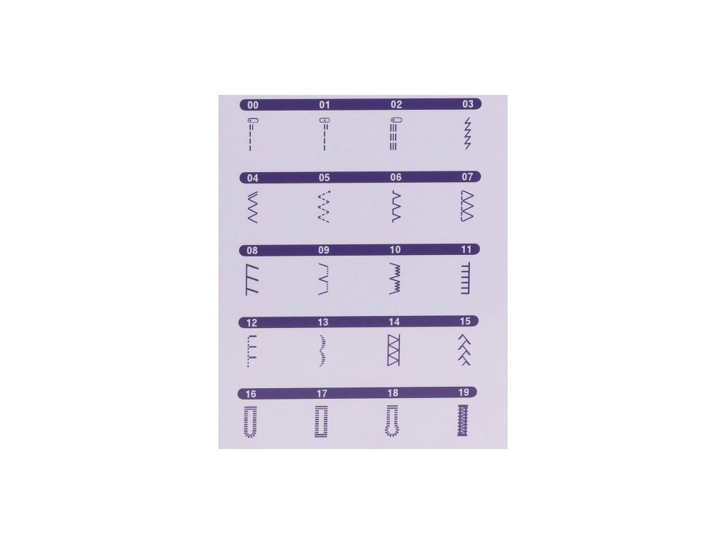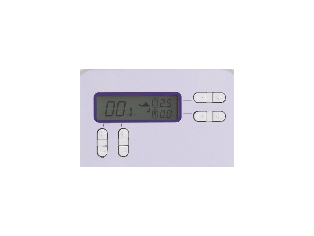 - Displej zobrazujúci zvolený steh, odporúčanú pätku, šírku aj dĺžku stehu