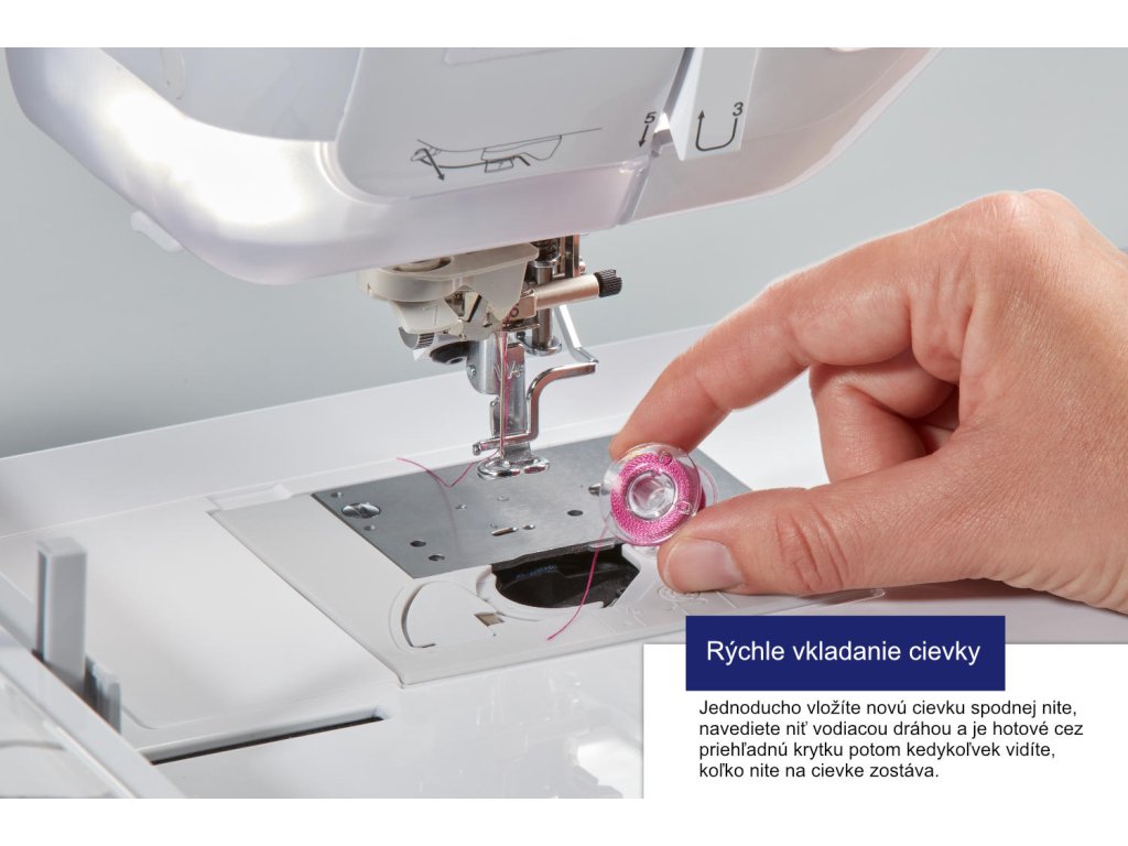 - Rýchle nasadenie spodnej nite- stačí vložiť natočenú cievku a naviesť niť do vodiča a môžete šiť ďalej