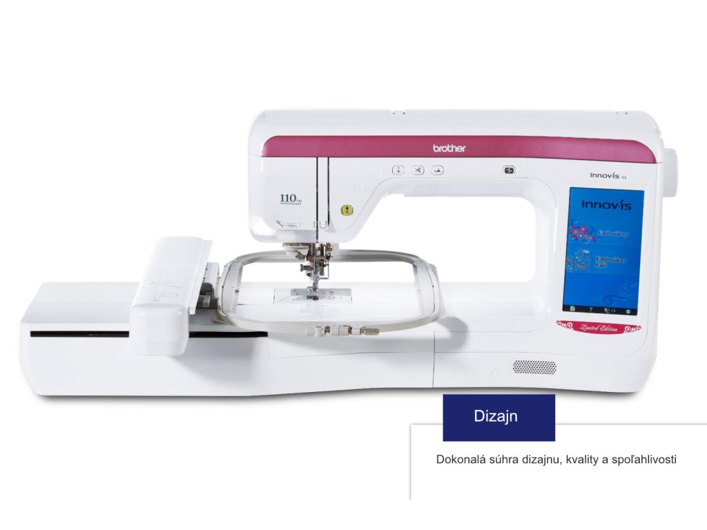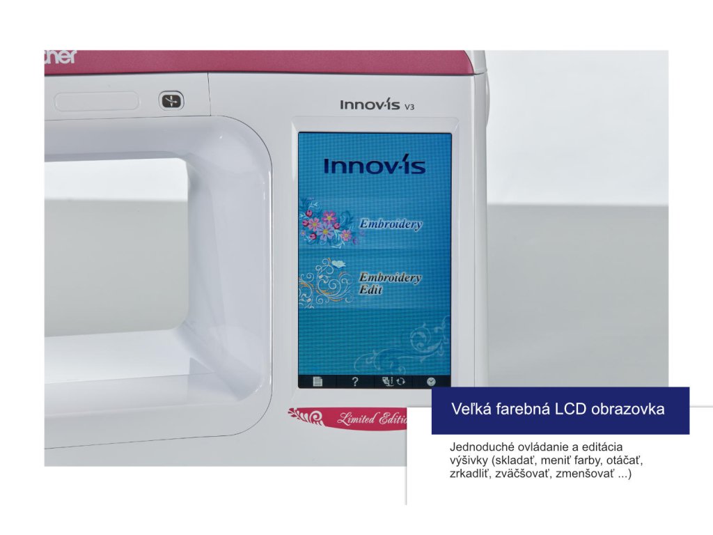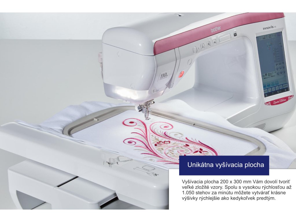 Vyšívacie stroje Brother INNOV V3 LE sú limitovanou edíciou obľúbených vyšívacích strojov V3 stroje vybavené špičkovými technológiami, ktoré umožňujú ich všestranné využitie a zároveň neuveriteľne ľahkú obsluhu! Obsahujú 227 vzorov výšiviek priamo v pamäti, 17 druhov písma, ktoré stroj vyšíva bez použitia počítača a extra veľkú vyšívaciu plochu 300 x 200 mm .