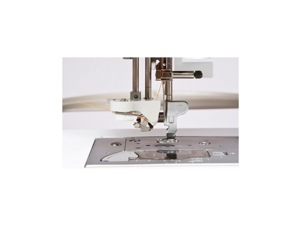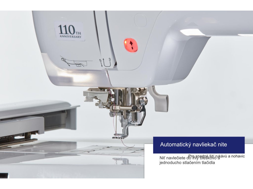 - Zabudovaný automatický navliekač nite (nit navlečiete stlačením tlačidla, stačí niť k ihle naviesť a do uška si ju už navlečie stroj sám), ktorý odstrihne hornú aj dolnú niť naspodu výšivky pri každej zmene farby