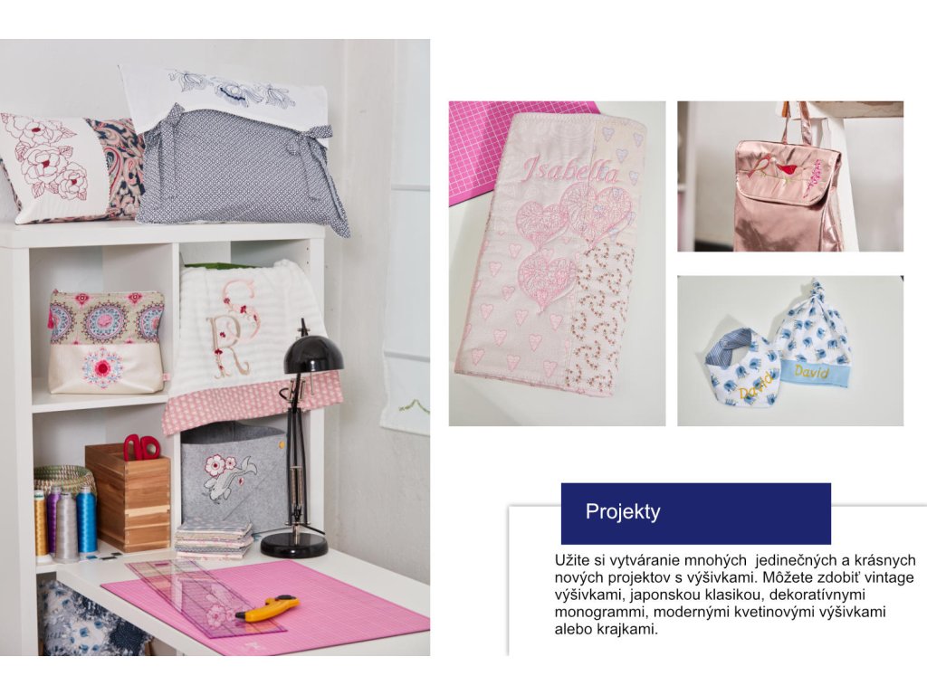 - Možnosť tvorby a uloženia vlastných stehov do pamäti stroja