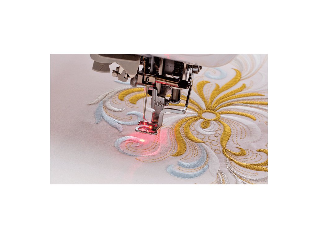 - Senzory kontroly pretrhnutej nite – pri detekcii problému stroj zastaví vyšívanie a informuje vás, že je pretrhnutá horná niť, alebo že sa minula niť na spodnej špulke