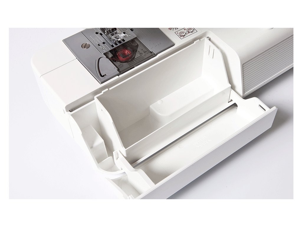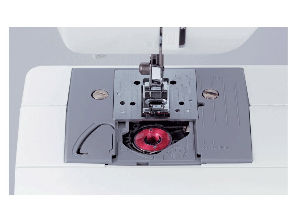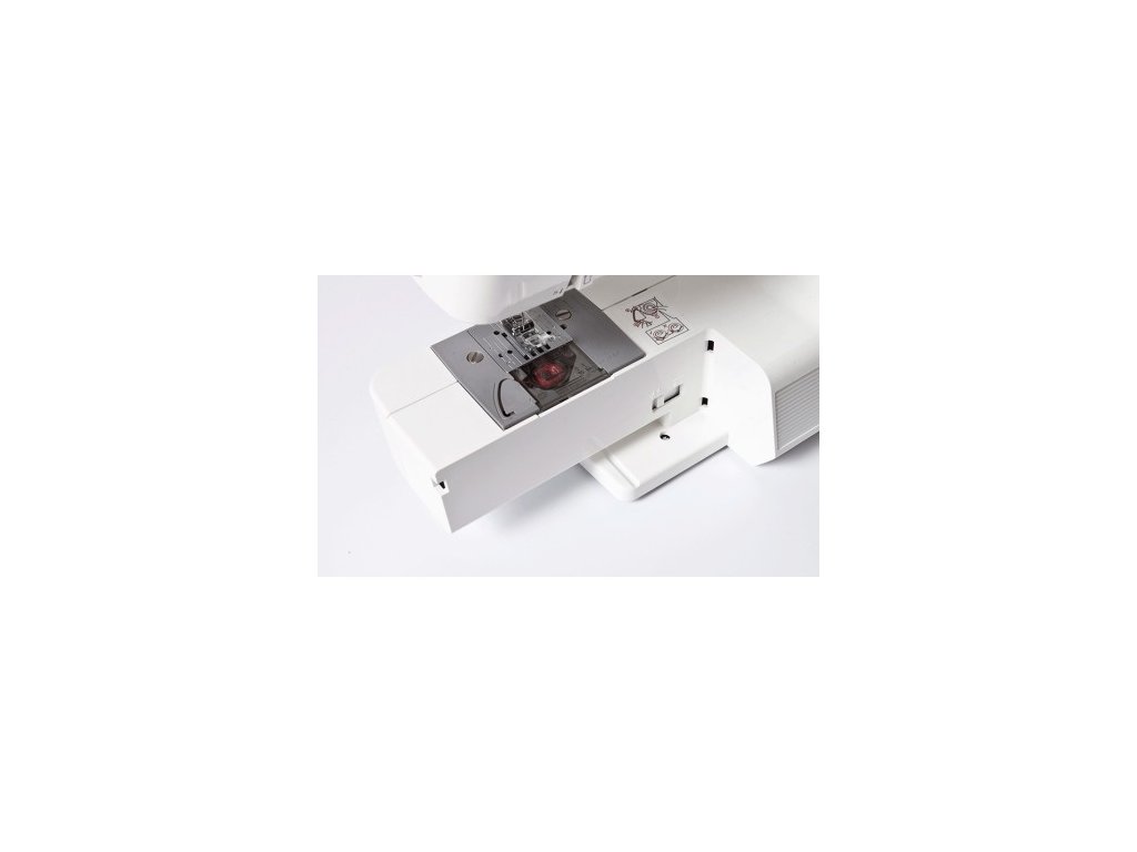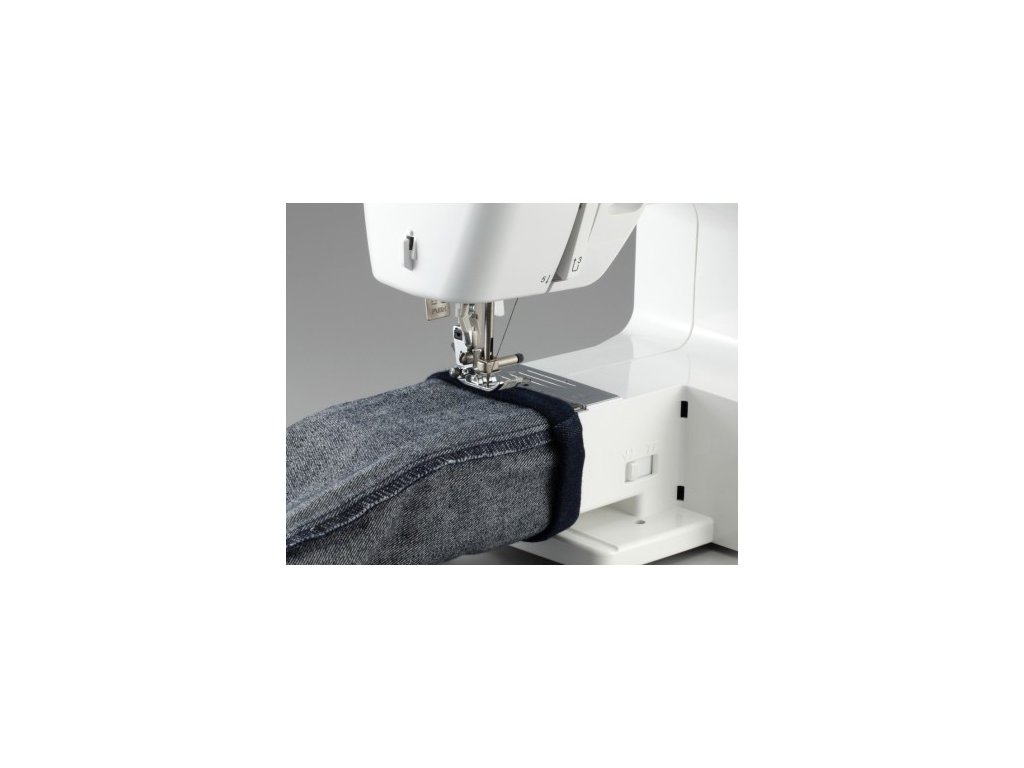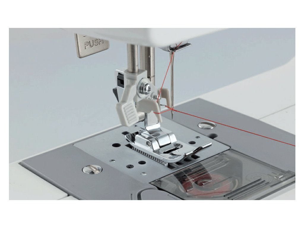Robustný mechanický šijací stroj na šitie hrubých aj tenkých materiálov, šírka stehu až 7 mm, 37 programov, voľne nastaviteľná šírka aj dĺžka stehu, automatickí gombíková dierka, navliekač nite do ihly, voľné rameno, jasné LED osvetlenie.