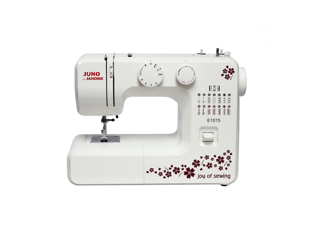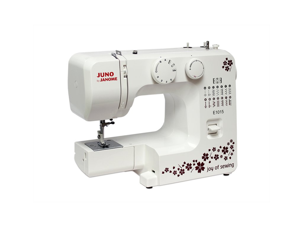 Šijací stroj Janome JUNO E 1015 je nový domáci šijací stroj pre bežné šitie v domácnosti s jednoduchým ovládaním a overlockovými stehmi. 15 šijacích programov, kývny CB chapač, voľné rameno a poloautomatická gombíková dierka šitá v 4 krokoch robia z tohto stroja ideálneho pomocníka na šitie. Na stoji možno regulovať dĺžku stehu a napätie hornej nite. Jedná sa o kvalitný šijací stroj s vynikajúcim pomerom medzi cenou a úžitkovou hodnotou. Má jednoduché ovládanie a robustnú konštrukciu tela.