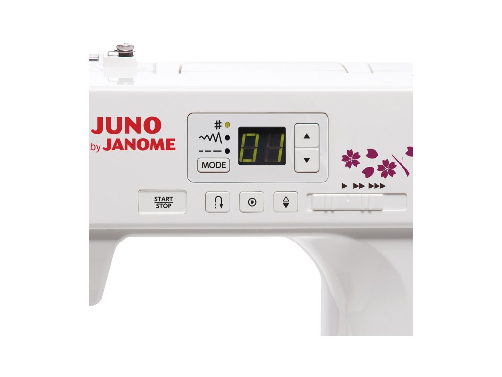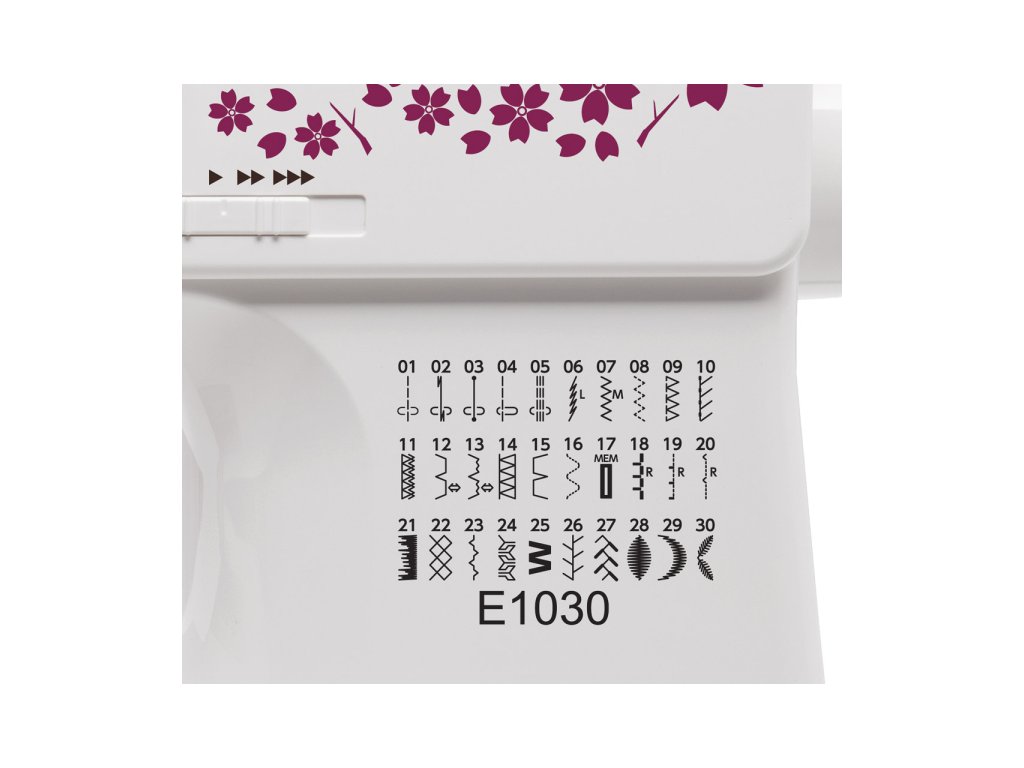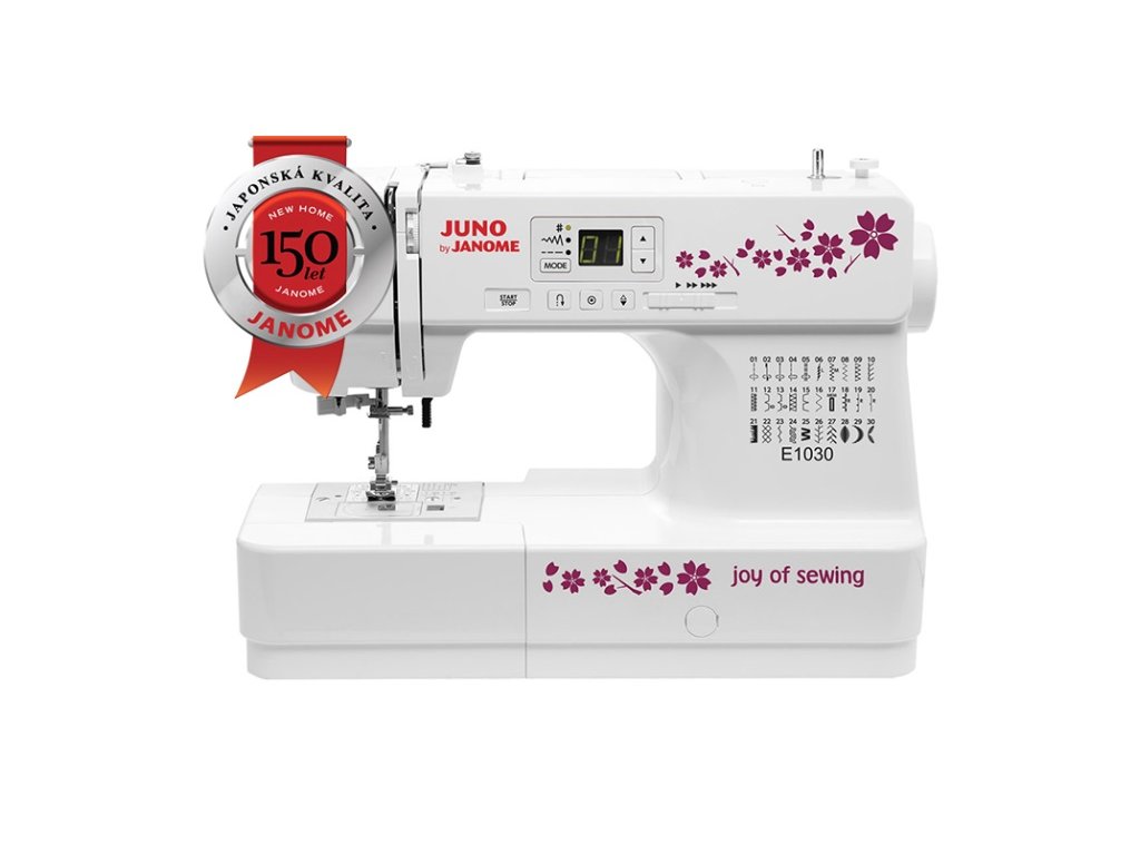 Šijací stroj Janome JUNO E1030 je nový elektronický šijací stroj značky Janome na bežné šitie v domácnosti s jednoduchým ovládaním, LED displejom, overlockovými stehmi a automatickou gombíkovou dierkou. Má 30 šijacích programov, horizontálny rotačný chapač s priehľadnou krytkou a voľným ramenom. Stroj má sedemnásobne delený podávač so špeciálne tvarovanými zúbkami, ktoré zaistia jednoduché začatie šitia a plynulé podávanie všetkých druhov látok.