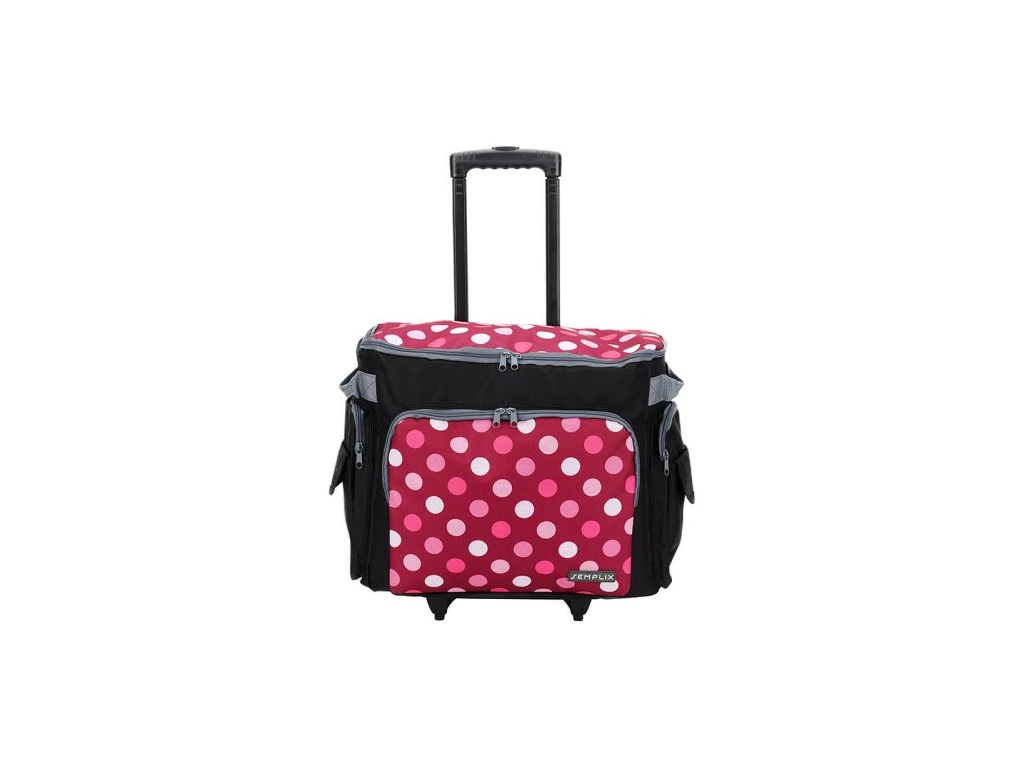 S vonkajšími rozmermi 50 x 43 x 32 cm ponúka priestranná hlavná priehradka dostatok miesta pre štandardné domáce šijacie stroje. Veko, ktoré je možné úplne otvoriť, s obojstranným zipsom, ktorý sa nezadrháva, uľahčuje balenie. Veľká prídavná predná priehradka a bočné vrecká poskytujú úložný priestor pre príslušenstvo. Odolný, umývateľný a polstrovaný vonkajší materiál chráni stroj. Stabilná teleskopická rukoväť a široké kolieska umožňujú pohodlnú prepravu. Vďaka atraktívnemu dizajnu Polka Dots je tento vozík skutočným magnetom pre oči.
