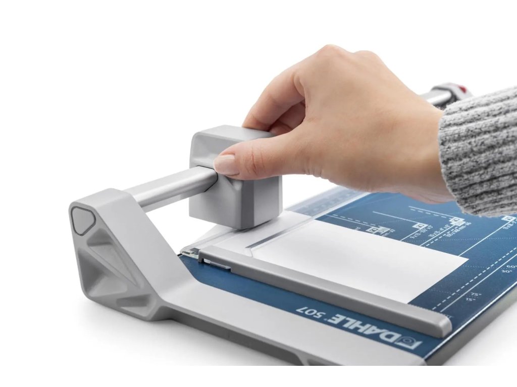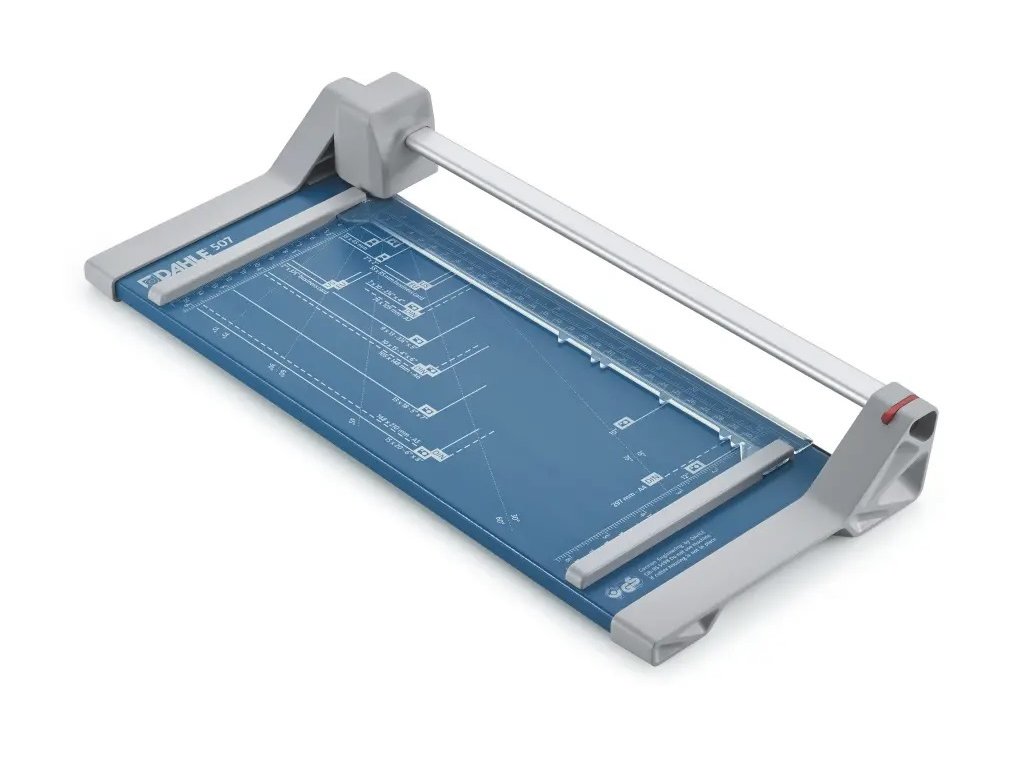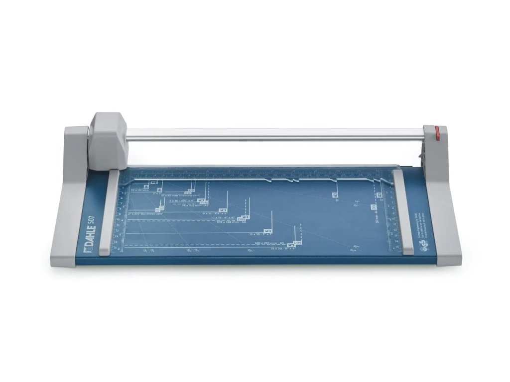 Rotačné rezačky DAHLE 507 sú hobby rezačky s kruhovým nožom a kovovou základňou. Rezačky majú rotačný nôž uložený v plastovom kryte, sú vybavené automatickým prítlakom, mierkou v cm a DIN formátoch. Rezačky DAHLE 507 sú vhodné na rezanie papiera, etikiet, fotiek a filmov. Rezačky možno dovybaviť sadou 3 rezných hláv DA960000 na perforovaný rez, cik-cak rez a vyrobenie ručného okraja.