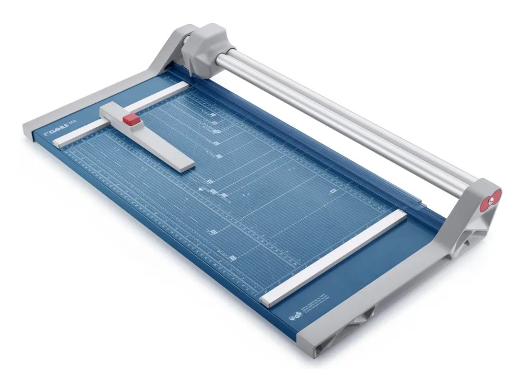 Rotačné rezačky DAHLE 552 sú profesionálne rezačky s kovovou základňou a presným rezom na grafické účely (papier, fólie, filmy... ). Kruhový nôž umiestnený v plastovom ochrannom kryte sa automaticky brúsi pri rezaní o protinôž – oba nože sú z tvrdenej ocele. Rezačky sú vybavené automatickým prítlakom vznikajúcim pohybom rezacej hlavy, zadným dorazom, mierkou v cm a v palcoch. Na pracovnom stole sú vyznačené aj formáty DIN. Rezačky DAHLE 552 možno namontovať aj na stenu.
