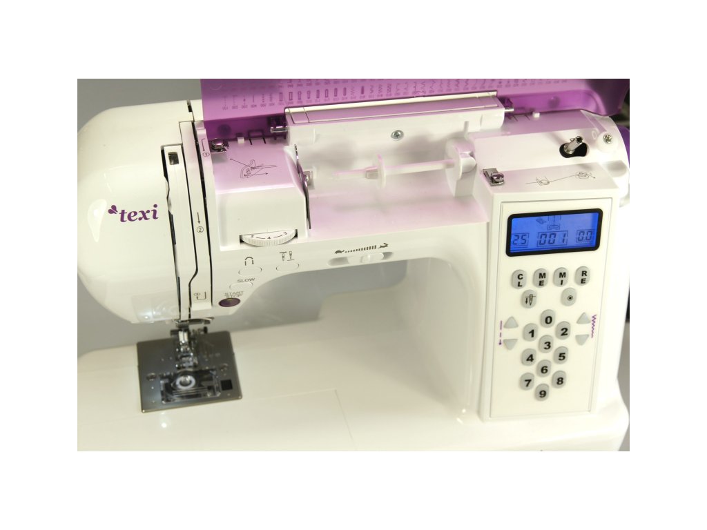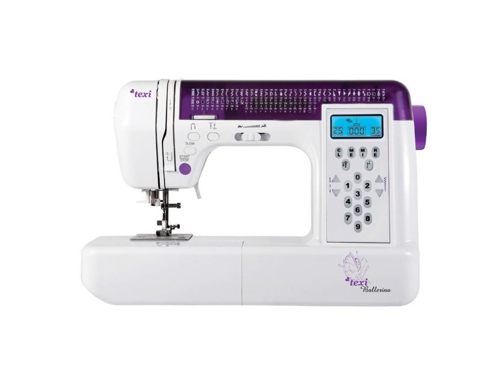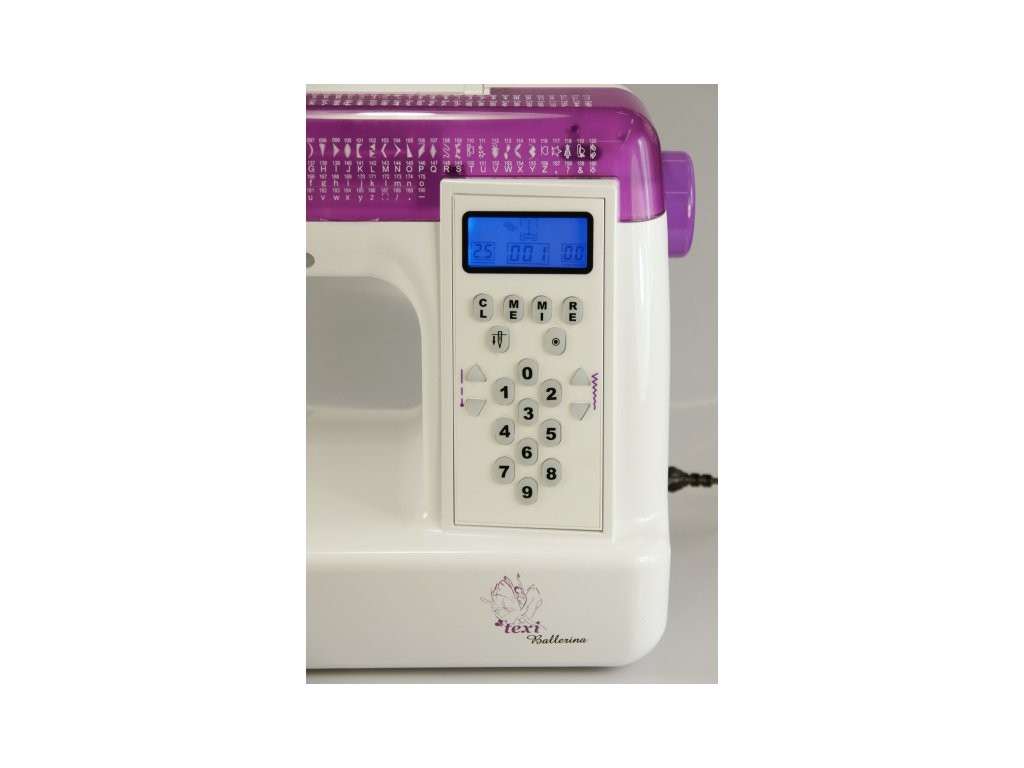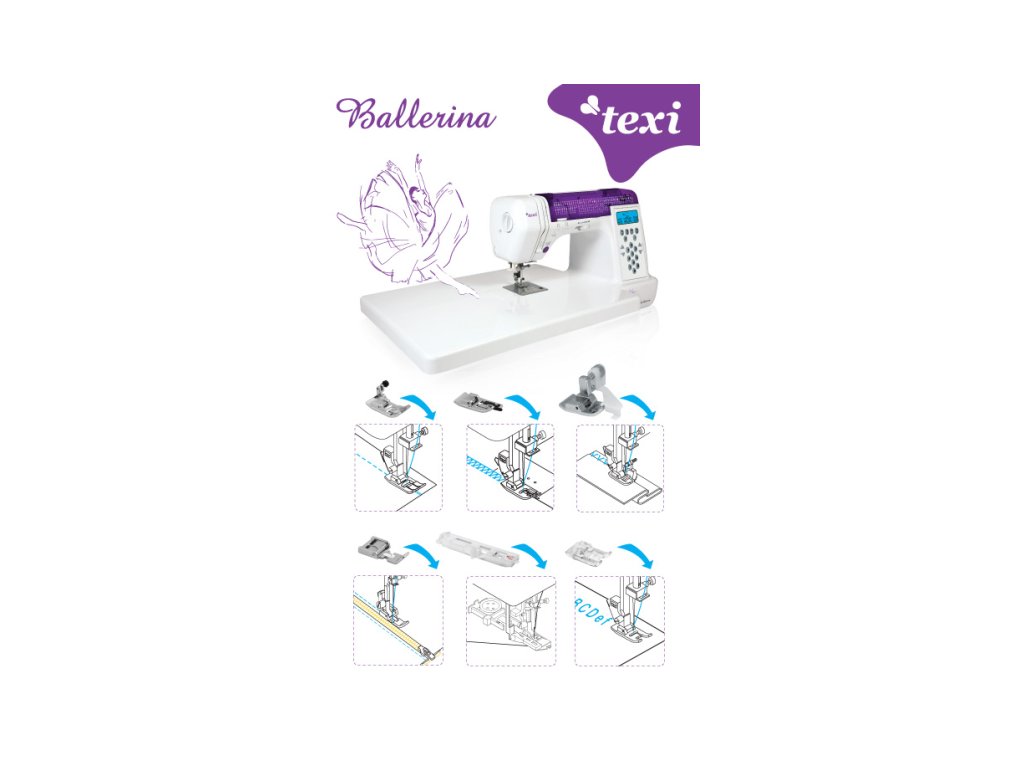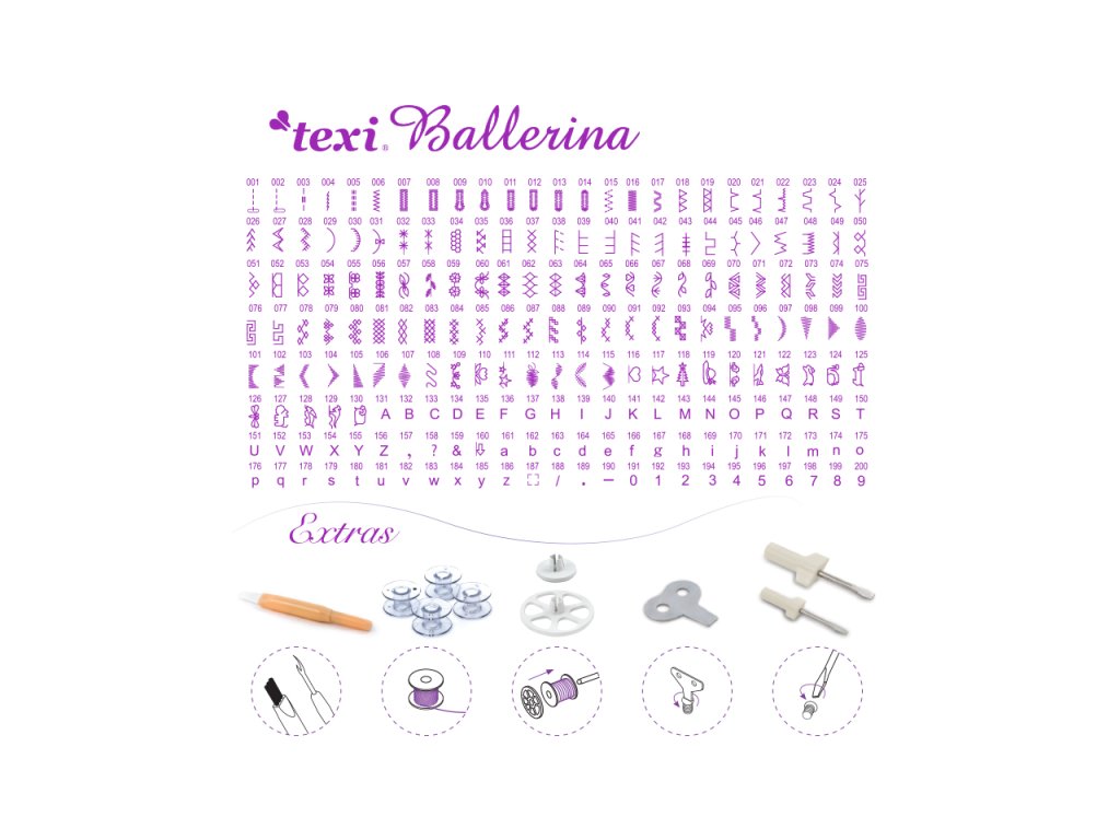 Šijacie stroje Texi Ballerina okrem spomínaných 200 druhov stehu poteší mnohých užívateľov možnosť vyšívania abecedy a možnosť nakombinovať a uložiť do pamäti až 40 stehov. LCD displej zobrazuje všetky informácie o zvolenom stehu, pomocou tlačidiel môžete veľmi ľahko a rýchlo zmeniť prednastavenú dĺžku a šírku stehu. Priaznivcov patchworku poteší funkcia polohovania ihly hore/dolu a tlačidlo START/STOP umožňujúce šitie bez pedálu. Zabudovaný automatický navliekač ihly uľahčuje pracné navliekanie nite do uška ihly. Horizontálny chapač umožňuje pohodlné sledovanie množstva nite navinutého na spodnej cievke.